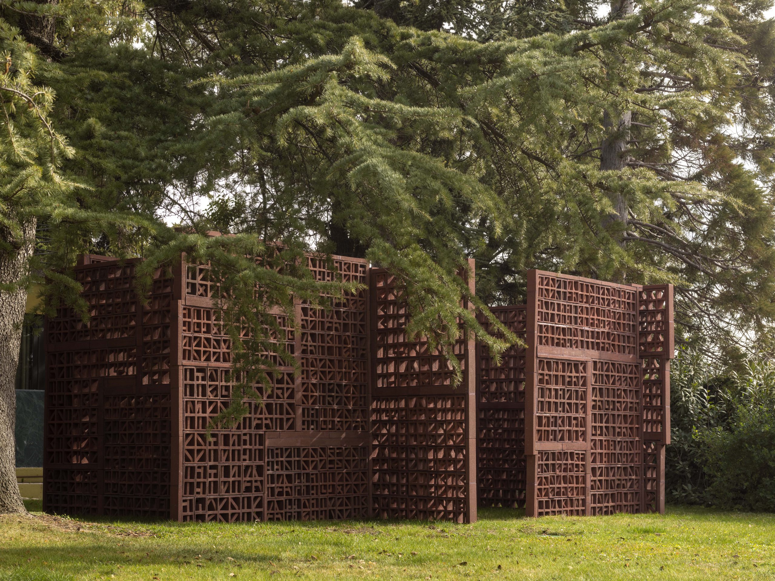 Celosía XI (Hafsa Bint Al-Hayy) (2006) consists of seven terracotta screens that evoke the lattices in Arab architecture. Iglesias co-opts their traditional geometric patterns by incorporating words into the structure of the screens. Passing through the enclosures is akin to reading passages of text. The title refers to the celebrated Andalusian poet Ḥafṣa bint al-Ḥājj ar-Rakūniyya (1135-1191).