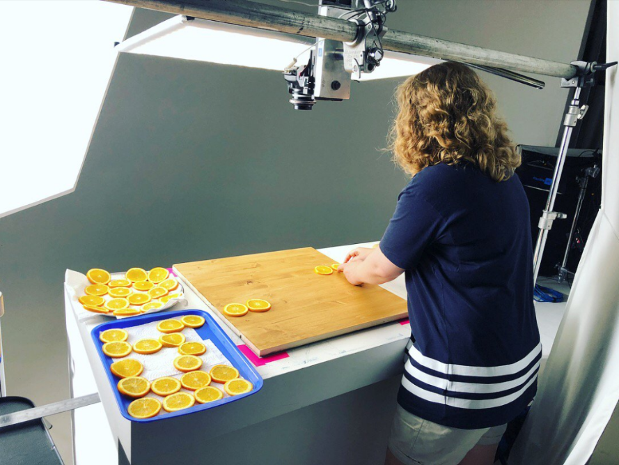 The shoot required a lot of precision. We even had to slice the orange segments very finely and cover the back in greaseproof paper to ensure no juice leaked on to our specially painted wood backgrounds! Meticulous. But hey the results were worth it!